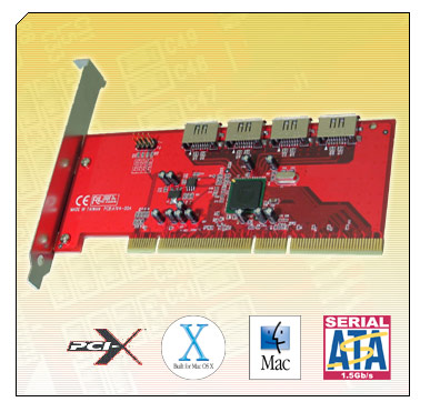 The SeriTek/1V4 Host Adapter provides an easy and affordable way for Macintosh users to add inexpensive, high-speed storage. With four internal Serial ATA ports, each offering 1.5Gbits/sec performance, the SeriTek/1V4 provides the high bandwidth to meet the needs of performance-hungry applications. The SeriTek/1V4 is PCI-X compatible, permitting Power Mac G5 users to take advantage of the latest extended PCI technology while maintaining backward compatibility with older Power Macintosh systems.