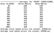 500MB/sec. when 10% full and over 330MB/sec. when 90% full.