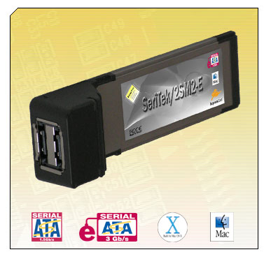 The SeriTek/2SM2-E extends SATA's astounding performance beyond the desktop, enabling content producers to capture, develop, edit and create content in almost any environment when using Apple's new MacBook Pro notebook computers. With transfer rates up to 3 gigabits per second per port, this breakthrough solution sets a new standard for handling data in a remote setting. FirmTek's established hot-swap compatibility also makes it easy for users to move entire drives and arrays from the MacBook Pro to any FirmTek-equipped desktop system in seconds.