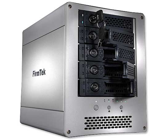 San Francisco, California (January 15, 2008) -- FirmTek, LLC, a pioneer and leader in Serial ATA (SATA) storage solutions for the Macintosh platform, has announced the SeriTek/5PM SATA enclosure with Port Multiplier technology. This breakthrough solution houses up to 5 hot-swappable drives, each with transfer rates as high as 3 gigabits per second, delivering potential aggregate hard drive performance beyond 220 megabytes per second with just one cable. When configured with three additional SeriTek/5PM enclosures (for a total of 20 drives), RAID 0 performance can exceed 700 megabytes per second. The remarkable performance and capacity of the SeriTek/5PM supports uncompressed streaming video, photography, storage and archiving, as well as other activities involving large media or image files. FirmTek's established hot-swap compatibility also makes it easy for users to move entire drives and arrays between any FirmTek-equipped systems, or into secure storage, in seconds.