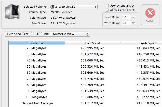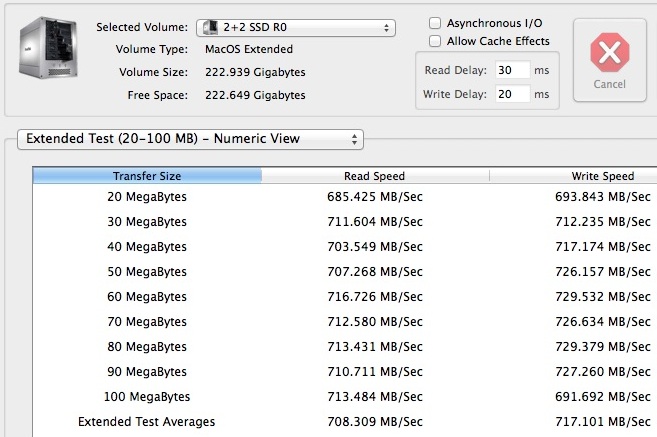 of SeriTek/6G2+2 performance using a RAID 0 configuration with dual 6G SSDs. A 2009 Apple Mac Pro 2.26 GHz running Mac OS X 10.9.2 with 12GB of memory was used