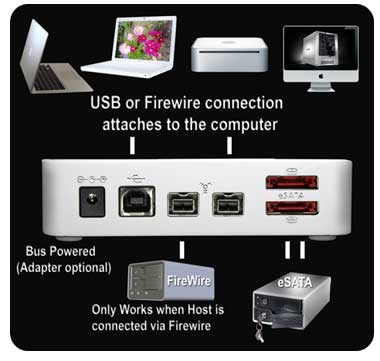 - Features dual external eSATA and a FireWire device port