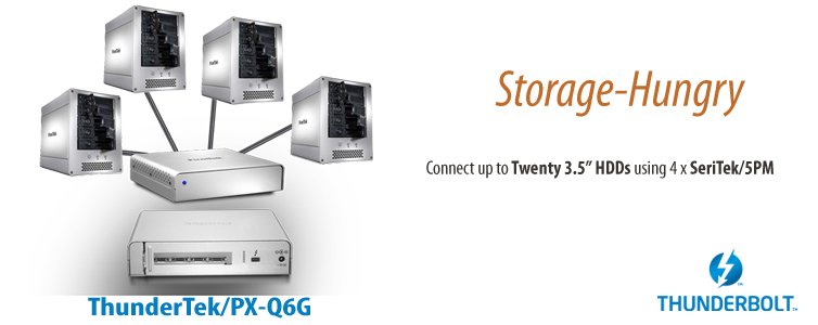 ThunderTek/PX-Q6G offers high-speed data transfers and lots of configuration options which fuels professional customers with the tools they need to get the job done in record time. ThunderTek/PX-Q6G was designed to excel with audio/video editing, computer animation, digital photography, portable computing, storage expansion, backup and any application where external eSATA high performance data storage is desirable.